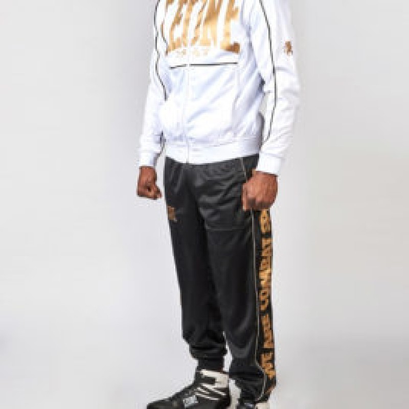 El chandal Leone Premium blanco es cómodo, práctico e impactante. El gran logo en el pecho y el acabado dorado lo embellecen y lo convierten en un traje adecuado para todos aquellos que quieran destacarse con una prenda nunca banal. Las letras laterales somos deportes de combate enriquecen los pantalones, mientras que los tobillos y los cordones de la cintura lo hacen aún más cómodo.