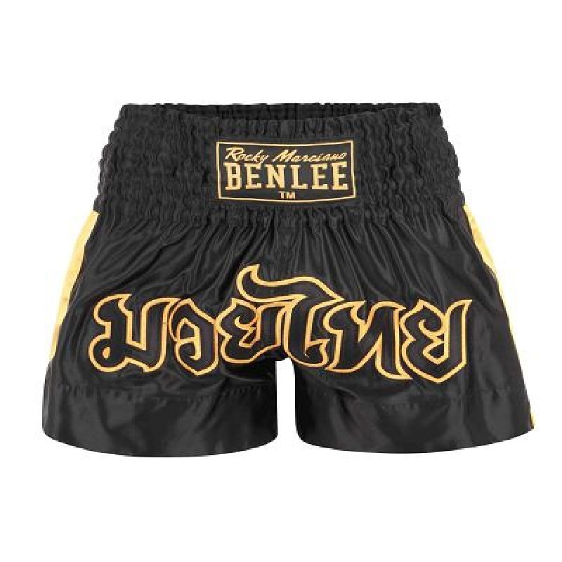 Pantalones de boxeo tailandés y patada «Rocky Marciano» de BenLee Goldy en negro/dorado con bordados elaborados. Con cinturilla de 12 cm de altura con cordón interior. El corte ingenioso ofrece mucha libertad de movimiento.
