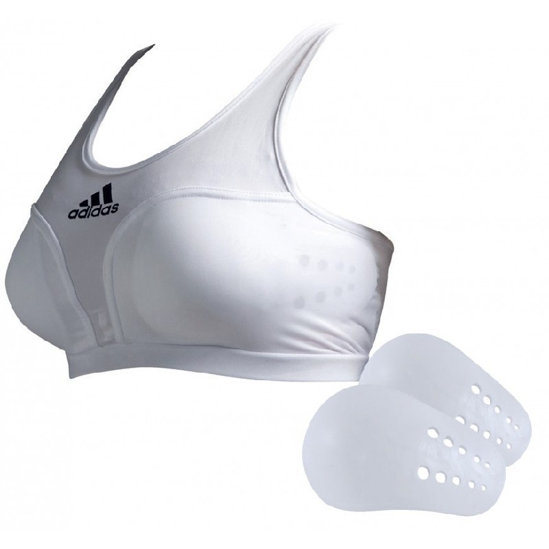Protector de senos Adidas con dos piezas semirrígidas de absorción de golpes. Transpirable y regula la temperatura.